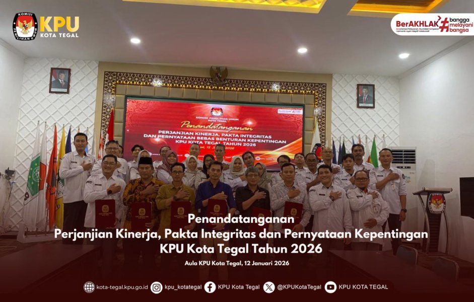 Senin, 12 Januari 2026 Komisi Pemilihan Umum Kota Tegal mengadakan Penandatanganan Perjanjian Kinerja, Pakta Integritas, dan Pernyataan Bebas Benturan Kepentingan sebagai wujud komitmen bersama dalam mewujudkan tata kelola pemerintahan yang profesional, transparan, dan akuntabel. Acara ini dibuka oleh Ketua KPU Kota Tegal, Bapak Karyudi Prayitno dan pengarahan dari Sekretaris KPU Kota Tegal. Melalui penandatanganan Perjanjian Kinerja, Pakta Integritas, dan Pernyataan Bebas Benturan Kepentingan, kami siap memberikan kinerja terbaik yang bersih dan bertanggung jawab. ....