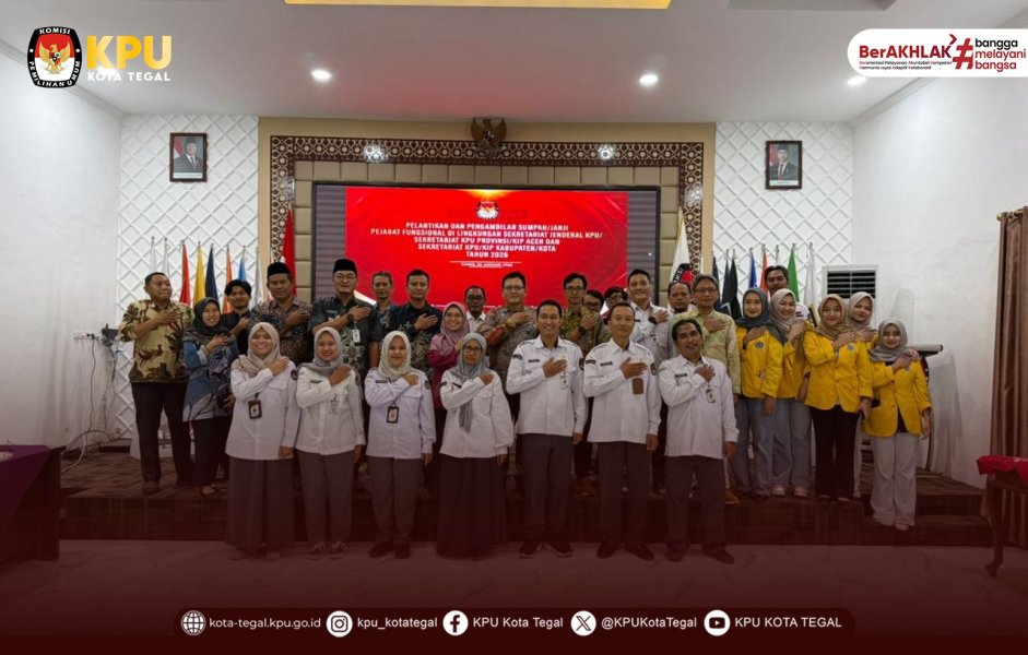 #TemanPemilih Menindaklanjuti Surat Sekretaris Jenderal KPU RI Nomor 63/SDM.09-Und/04/2026 tanggal 21 Januari 2026 perihal Undangan Pelantikan, bersamaan dengan hal tersebut maka KPU Kota Tegal hadir melalui zoom meeting untuk mengikuti kegiatan Pelantikan dan Pengambilan Sumpah/Janji Pejabat Fungsional Penata Kelola Pemilihan Umum di Lingkungan Sekretariat Jenderal KPU, Sekretariat KPU Provinsi/KIP Aceh dan Sekretariat KPU/KIP Kabupaten/Kota Tahun 2026. Sebanyak 8 pegawai KPU Kota Tegal telah dilantik dan diambil sumpah sebagai Jabatan Fungsional Penata Kelola Pemilihan Umum. Kegiatan ini dihadiri oleh Jajaran Komisioner KPU Kota Tegal, Sekretaris, Jajaran Pejabat Struktural dan seluruh pegawai KPU Kota Tegal. #kputegal #kpujateng #kpuri #kpumelayani ....
