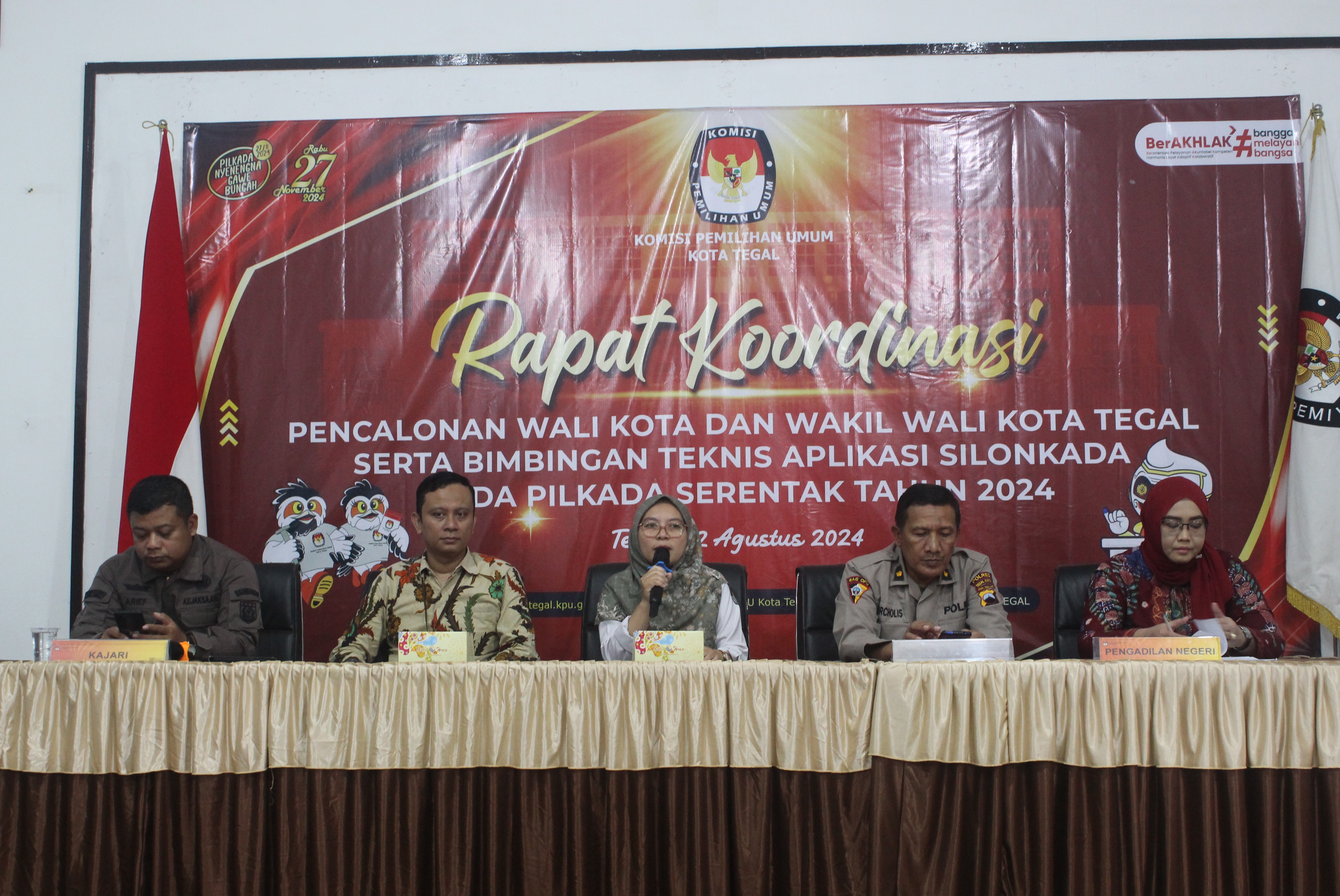 Komisi Pemilihan Umum (KPU) Kota Tegal menggelar Rapat Koordinasi Pencalonan Wali Kota dan Wakil Wali Kota Tegal serta Bimbingan Teknis Aplikasi Silonkada pada Pilkada Serentak Tahun 2024 di Aula Kantor KPU Kota Tegal, pada Kamis (22/8/2024). Rapat dibuka oleh Ketua KPU Kota Tegal yang diwakili oleh Anggota KPU Kota Tegal Divisi Hukum dan Pengawasan, Mohammad Masyhadi, menyampaikan bahwa tahapan Pilkada 2024 yang sedang berjalan yaitu Pengumuman Pendaftaran Pasangan Calon pada tanggal 24 – 26 Agustus 2024, dan Pendaftaran Pasangan Calon pada tanggal 21 – 29 Agustus 2024. Pasangan calon diharapkan untuk mempersiapkan diri begitu juga dengan penyelenggara, peserta, dan Desk Pilkada serta pihak yang berkepentingan dalam Pilkada 2024. Semua masyarakat mempunyai kewajiban untuk menyukseskan Pilkada dengan bekerja sama dan berkoordinasi untuk menyamakan persepsi agar Pilkada berjalan lancar serta menghasilkan pemimpin yang sukses tanpa ekses dengan penuh suka cita sebagai bagian dari pesta demokrasi yang sesuai dengan tagline Pilkada Nyenengna Gawe Bungah, ucap Masyhadi. Rapat ini dihadiri oleh Forkopimda, Ketua Desk Pilkada, OPD, partai politik, dan Bawaslu Kota Tegal. Rapat dimulai pukul 09.00 WIB dengan agenda utama yaitu pemaparan materi oleh Narasumber. Kabagops Polres Tegal Kota, Nur Cholis, menyampaikan Peranan Polri pada Pilkada Serentak Tahun 2024 dengan dasar hukum UU RI Nomor 2 Tahun 2002 (Pasal 28) tentang POLRI. Disampaikan juga materi tentang Potensi Kerawanan Pilkada dan Mekanisme Pelayanan SKCK terhadap calon Kepala Daerah. Penerbitan SKCK mendasari PKPU Nomor 8 Tahun pasal 14 ayat 2 dan pasal 22 ayat 2. Pembuatan SKCK bisa dilakukan melalui web atau datang langsung ke Polres Tegal Kota. Hakim Pengadilan Negeri Tegal, Windy Ratna Sari, menambahkan bahwa menjadi Paslon harus ada SKCK yang dikeluarkan polisi dan ditandatangani Kapolres serta Surat Keterangan dari Pengadilan Negeri dan ditandatangani Ketua Pengadilan Negeri. Disampaikan juga materi Tindak Pidana Pemilihan Umum dengan dasar hukum UU Nomor 7 Tahun 2017 tentang Pemilihan Umum.  Kepala Seksi Intelijen Kejaksaan Negeri Kota Tegal, Ariefulloh, menyampaikan materi tentang Peran Kejaksaan Negeri Kota Tegal dalam Pilkada Tahun 2024 diantaranya mencegah terjadinya pelanggaran, bertindak sebagai penuntut umum dan pelaksana putusan pidana dalam perkara Pilkada, serta sebagai jaksa pengacara Negara apabila terjadi gugatan terhadap KPU terkait penetapan Paslon, SK KPU, dan perselisihan hasil. Kadiv Teknis Penyelenggaraan, Moh. Mansur Syariffudin, menyampaikan hal –hal yang harus diperhatikan di antaranya memastikan Paslon memenuhi persyaratan dan siap didaftarkan serta melakukan koordinasi ke KPU terkait jumlah massa dan waktu pendaftaran pada saat h-1 pendaftaran. Operator Silonkada, Putra Bagus Pratama, menjelaskan materi tentang Sistem Informasi Pencalonan Pilkada berbasis web sebagai fasilitasi tahapan pencalonan Pilkada. Rapat ditutup oleh KPU Kota Tegal dengan sesi Tanya - Jawab peserta dengan narasumber.