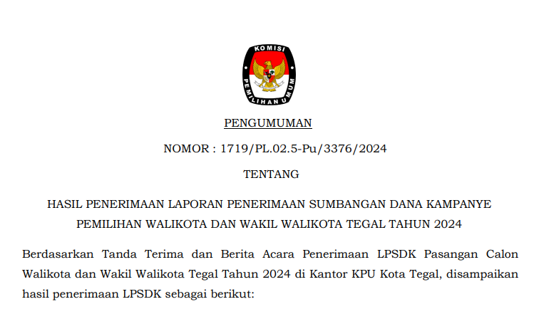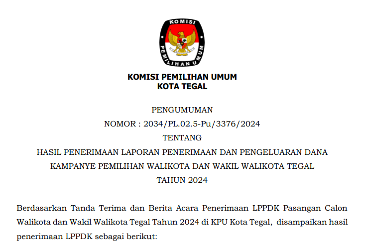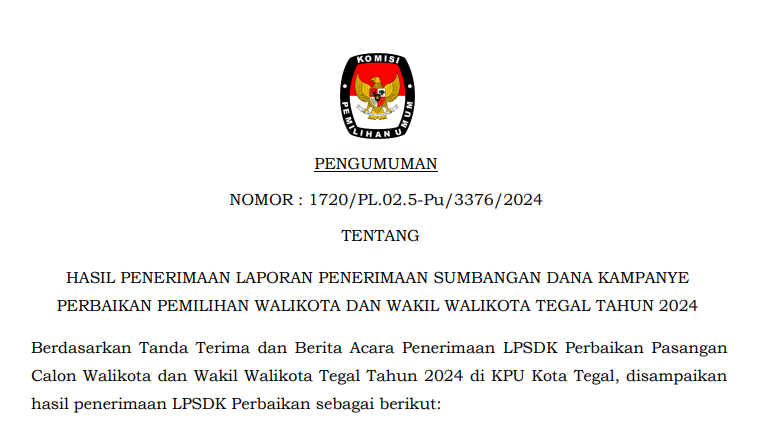 Pengumuman Hasil Penerimaan Laporan Penerimaan Sumbangan Dana Kampanye Pemilihan Walikota dan Wakil Walikota Tegal Tahun 2024 Sabtu, 26 Oktober 2024 07:00 1450 Pengumuman Hasil Penerimaan Laporan Penerimaan Sumbangan Dana Kampanye Pemilihan Walikota dan Wakil Walikota Tegal Tahun 2024 unduh di sini Baca Selengkapnya