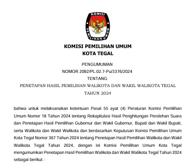 Pengumuman Penetapan Hasil Pemilhan Walikota dan Wakil Walikota Tahun 2024 Senin, 02 Desember 2024 07:00 1463 Pengumuman Penetapan Hasil Pemilhan Walikota dan Wakil Walikota Tahun 2024 unduh di sini Baca Selengkapnya