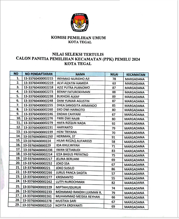 UNDUH DI SINI UNTUK MELIHAT SELURUH NILAI SELEKSI TERTULIS CALON PPK PEMILU 2024 KPU KOTA TEGAL