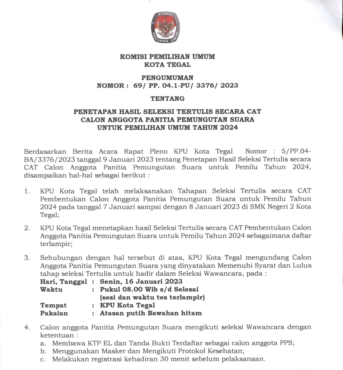 PENETAPAN HASIL SELEKSI TERTULIS SECARA CAT CALON ANGGOTA PANITIA PEMUNGUTAN SUARA UNTUK PEMILU 2024