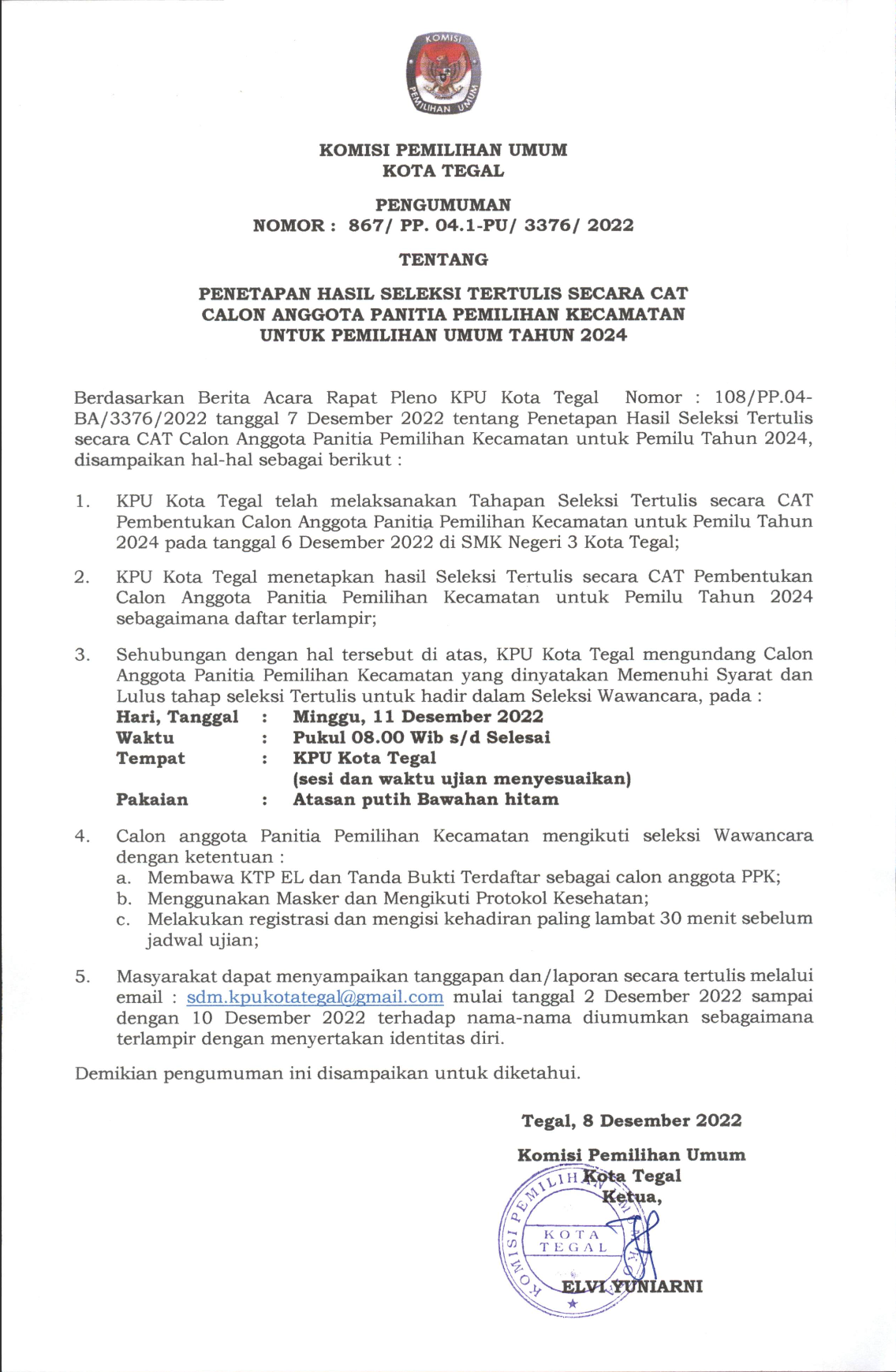 PENETAPAN HASIL SELEKSI TERTULIS SECARA CAT CALON ANGGOTA PPK PEMILU 2024