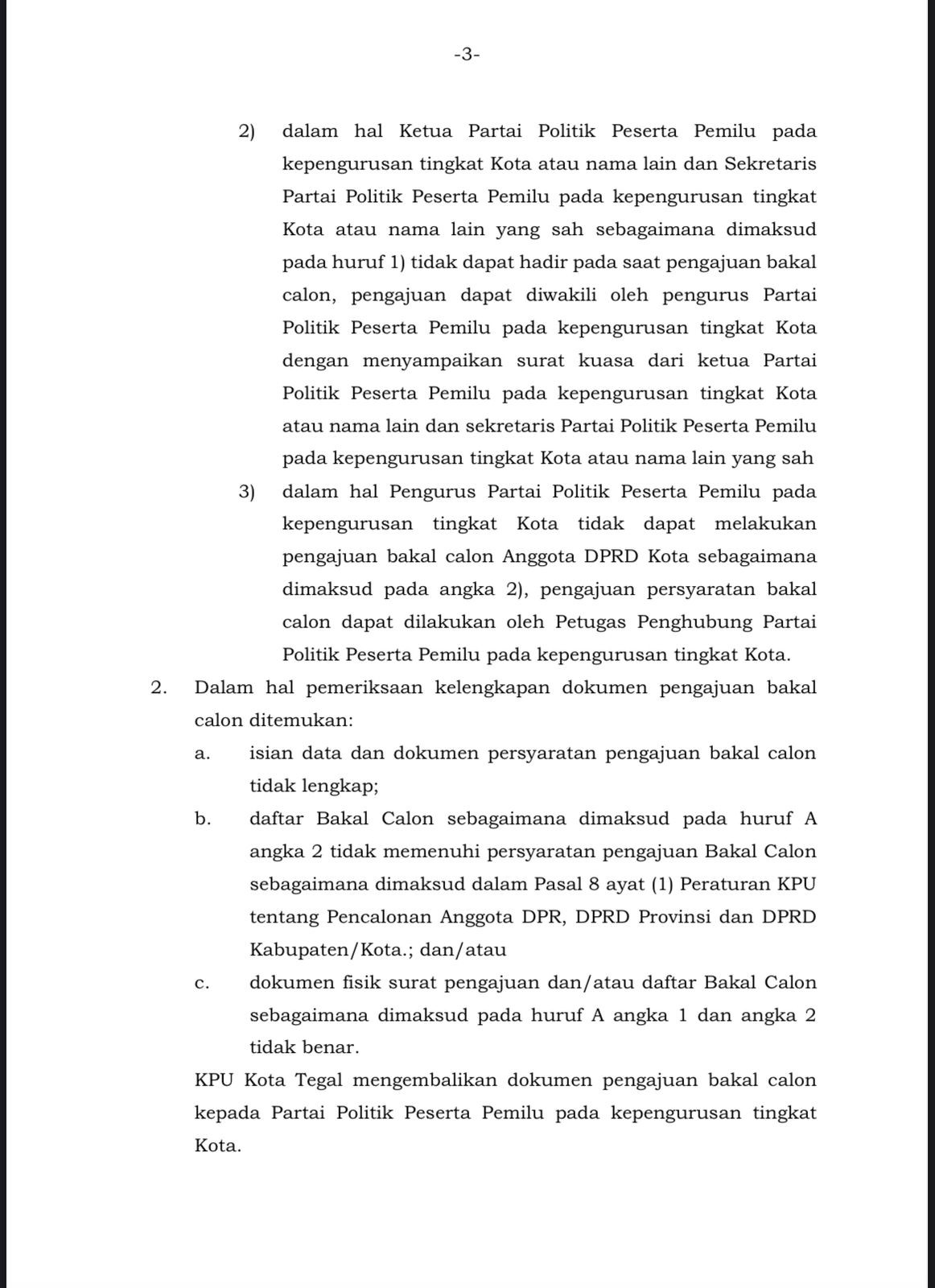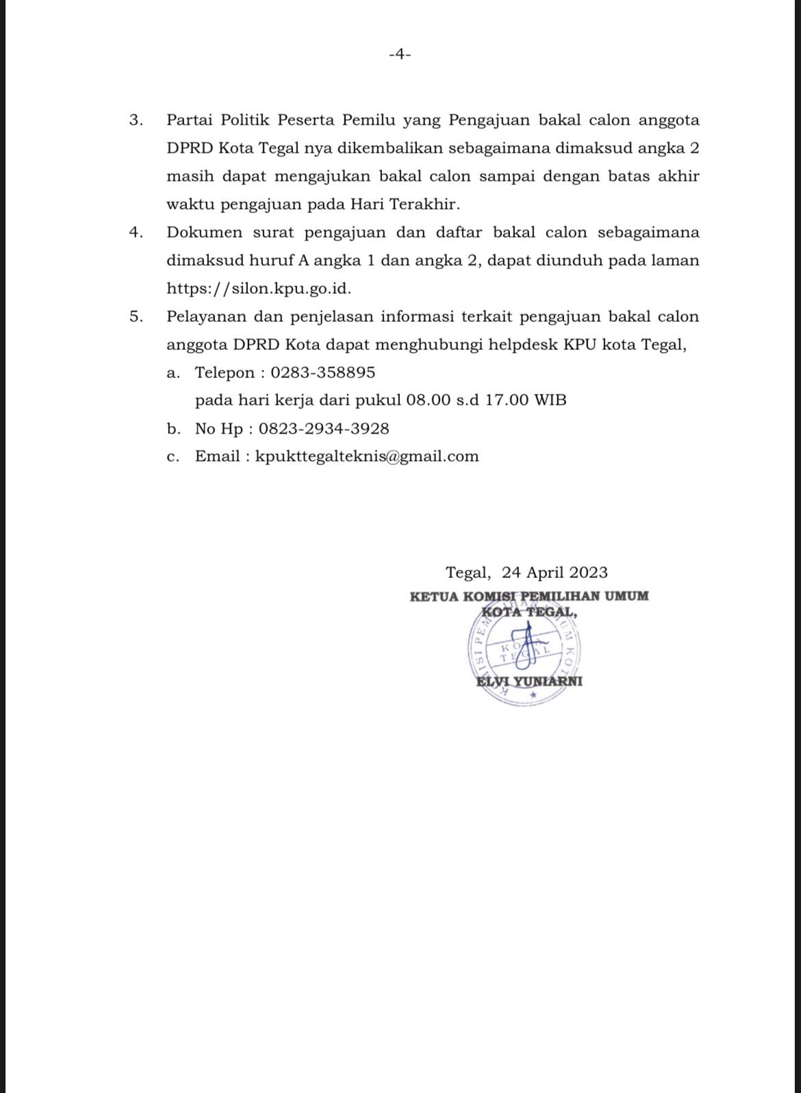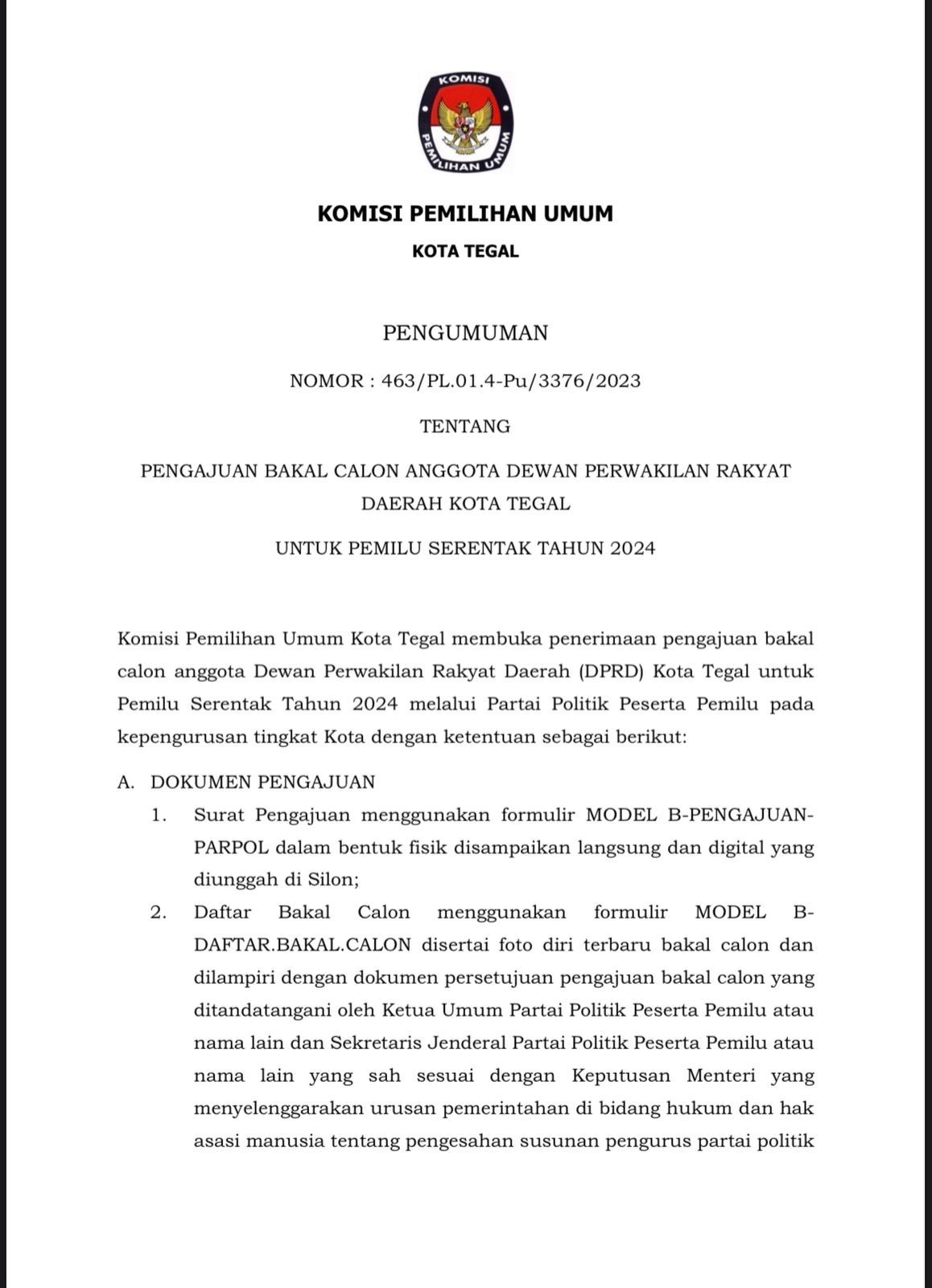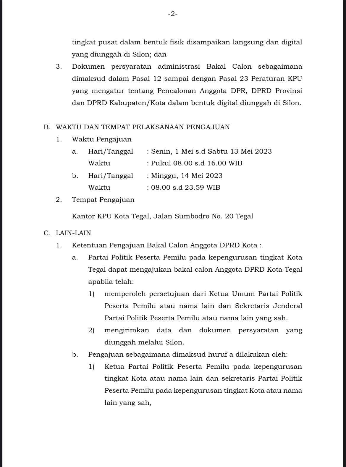 PENGAJUAN BAKAL CALON ANGGOTA DEWAN PERWAKILAN RAKYAT DAERAH KOTA TEGAL UNTUK PEMILU SERENTAK TAHUN 2024 Minggu, 23 April 2023 23:59 1591 SELENGKAPNYA UNDUH DI SINI Bagikan: Telah dilihat 1,591 kali