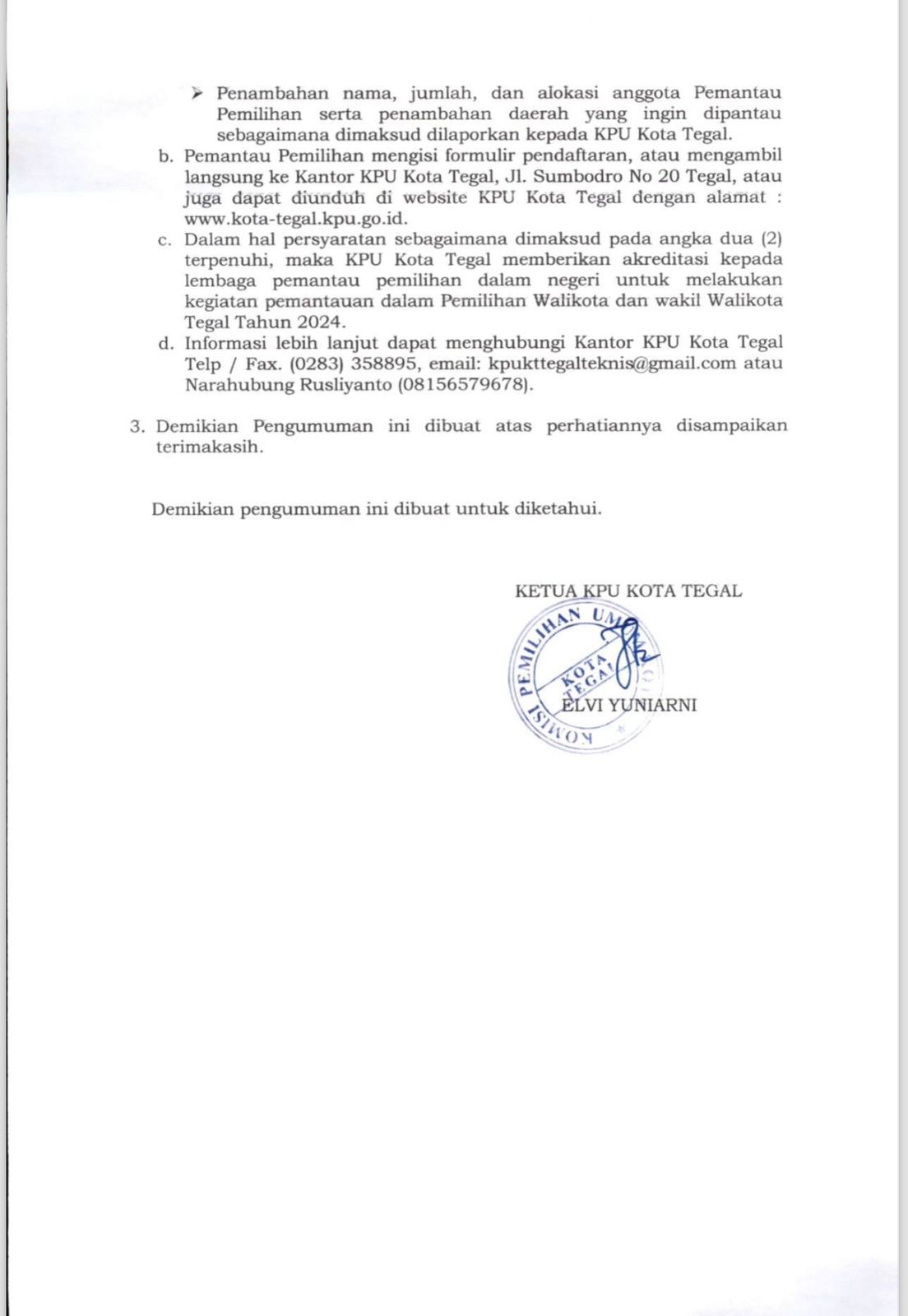 PENGUMUMAN PENDAFTARAN PEMANTAU PEMILIH WALIKOTA DAN WAKIL WALIKOTA TEGAL TAHUN 2024 Selasa, 27 Februari 2024 07:00 1271 untuk formulir dapat di klik di sini Bagikan: Telah dilihat 1,271 kali