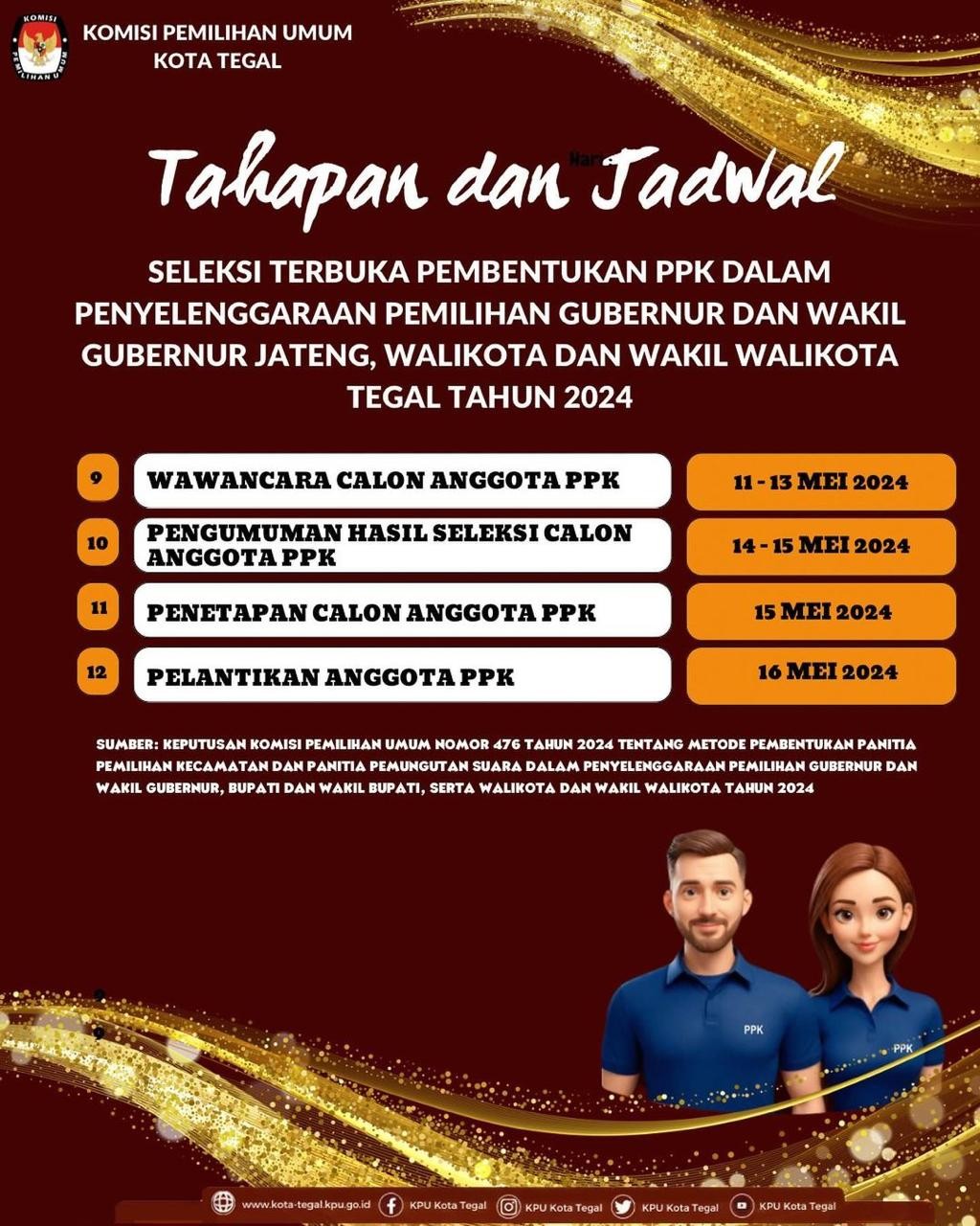Tahapan dan Jadwal Seleksi Terbuka Pembentukan PPK dalam Penyelenggaraan Pilkada Gubernur dan Walikota Tegal Tahun 2024 Senin, 22 April 2024 09:12 432 Tahapan Jadwal Pembentukan PPK Tahapan dan Jadwal Pembentukan PPK Bagikan: Telah dilihat 432 kali