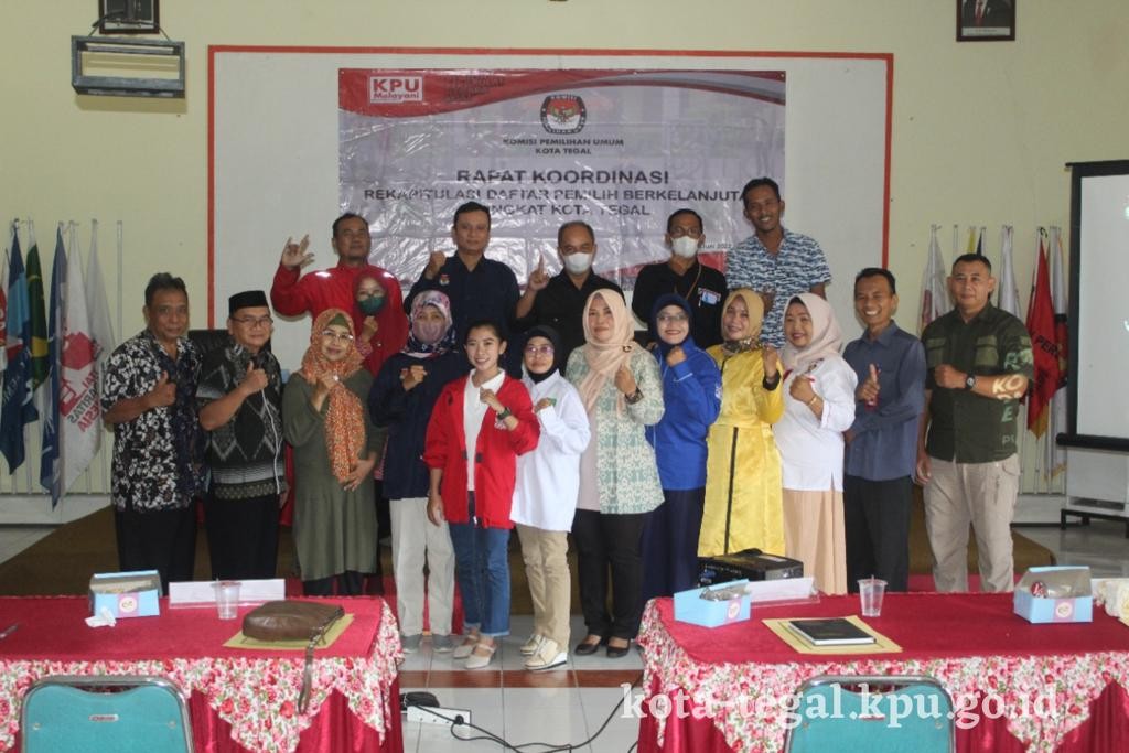 KPU Kota Tegal mengadakan Rapat Koordinasi Data Pemilih Berkelanjutan untuk periode Juni 2022 pada Selasa (28/06). Forum tersebut dihadiri Kepala Disdukcapil Kota Tegal, Basuki, SE.MM, Anggota Bawaslu Kota Tegal, Wiwoho Kertarto, perwakilan Bakesbangpol Kota Tegal, Akhmad Suharjo, S.IP, perwakilan Polres Tegal Kota, perwakilan Kodim 0712, dan perwakilan beberapa partai politik di Kota Tegal. Akhmad Khaerudin, SH selaku Divisi Perencanaan, Data dan Informasi KPU Kota Tegal memberikan pemaparan terkait hasil pemutakhiran daftar pemilih berkelanjutan untuk bulan Juni 2022. “Di bulan Juni, jumlah DPB untuk Kota Tegal sebanyak 202.777 pemilih. Jumlah tersebut bertambah sekitar 1.605 pemilih dari DPB bulan Mei. Berbeda dengan bulan sebelumnya, sumber data pemutakhiran DPB bulan Juni salah satunya adalah hasil padanan data antara KPU RI dengan Kemendagri". Secara rinci, jumlah 202.777 pemilih tersebut terdiri dari 49.727 pemilih di Tegal Selatan, 42.793 pemilih di Margadana, 49.523 di Tegal Barat, dan 60.734 di Tegal Timur. Berdasarkan jenis kelamin, 100.645 merupakan pemilih laki-laki dan 102.132 adalah pemilih perempuan. DPB sendiri merupakan pemutakhiran data pemilih berkelanjutan yang wajib dilakukan oleh KPU setiap bulan sesuai dengan PKPU 6 Tahun 2021 tentang Pemutakhiran Data Pemilih Berkelanjutan. Dengan adanya kegiatan tersebut, diharapkan data pemilih di Kota Tegal menjadi semakin akurat dan valid.(ul/) Unduh berita acara, rekapitulasi, dan daftar perubahan hasil PDPB Juni 2022 di sini