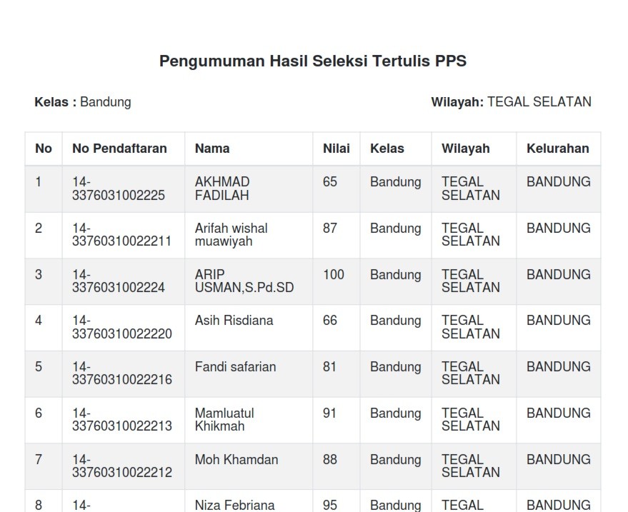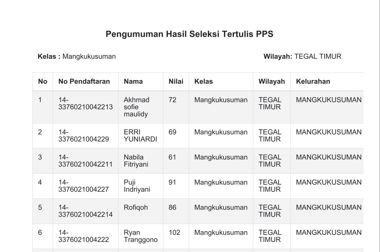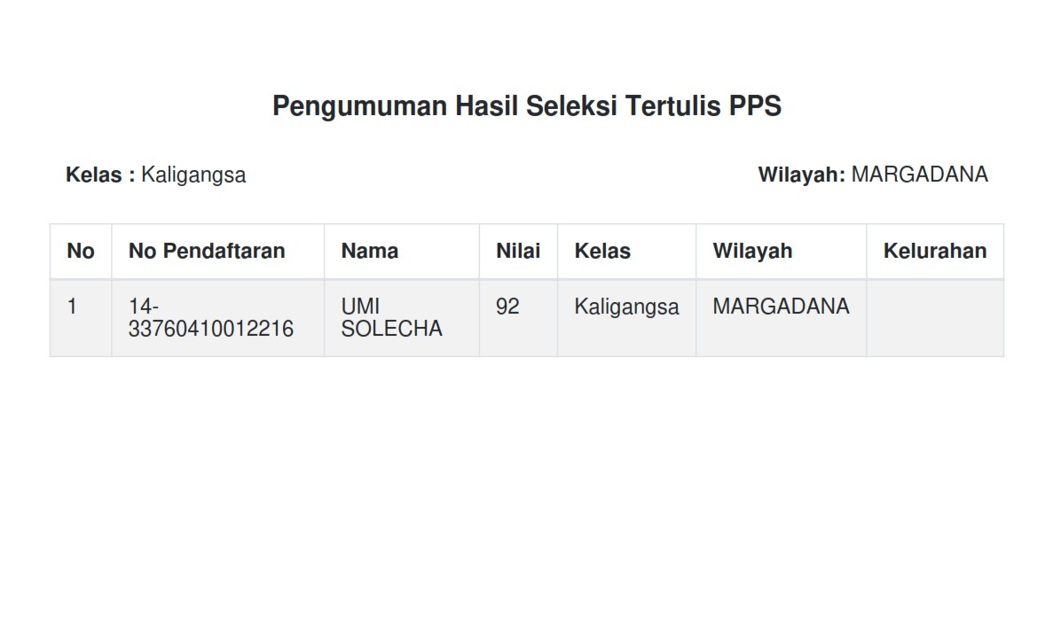 Setelah dilakukan pengecekan ulang data pada server yang digunakan untuk pelaksanaan Tes CAT sesi ke 2 PPS Pemilu 2024 KPU Kota Tegal pada tanggal 7 Januari 2023 berikut kami sampaikan hasil nilai tes atas nama Umi Solecha dengan nomor pendaftaran 14-33760410012216 Kelurahan Kaligangsa Kecamatan Margadana adalah sebagai berikut :