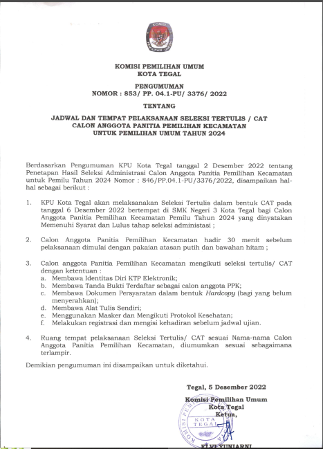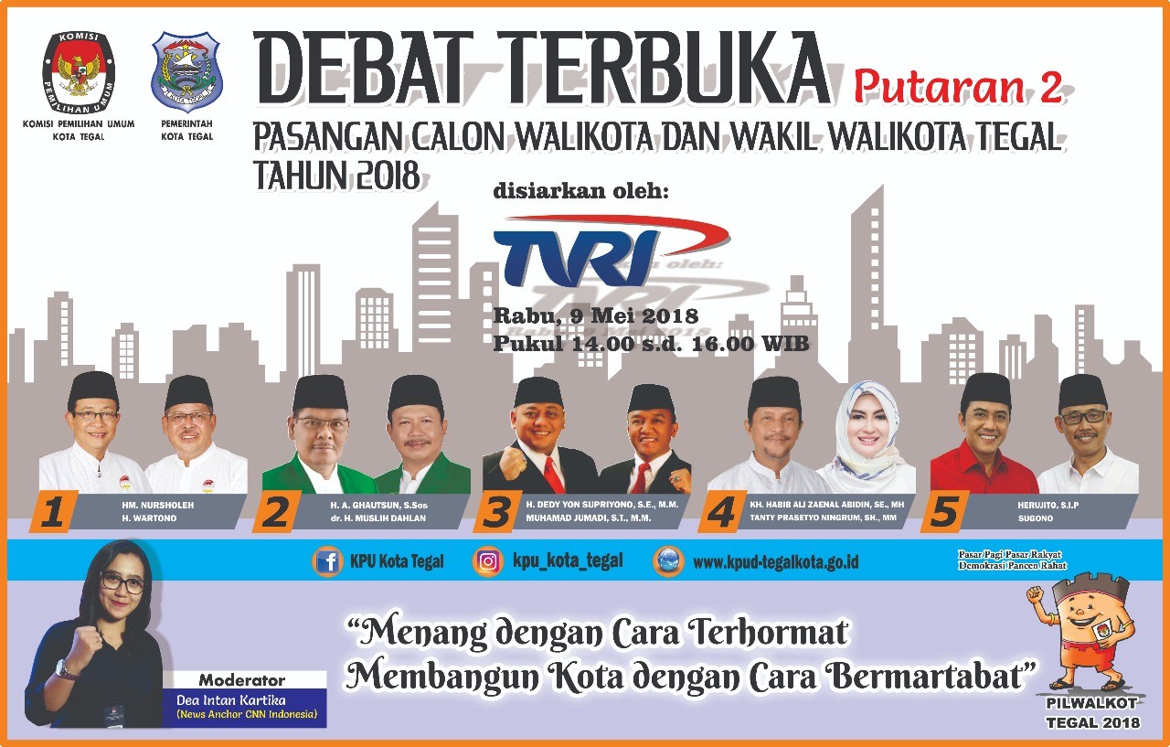 Jangan lupa hari ini Rabu, 9 Mei 2018, pukul 14.00 wib, KPU Kota Tegal akan menyiarkan Siaran Ulang Debat Publik Walikota dan Wakil Walikota di Stasiun Televisi TVRI Jawa Tengah.