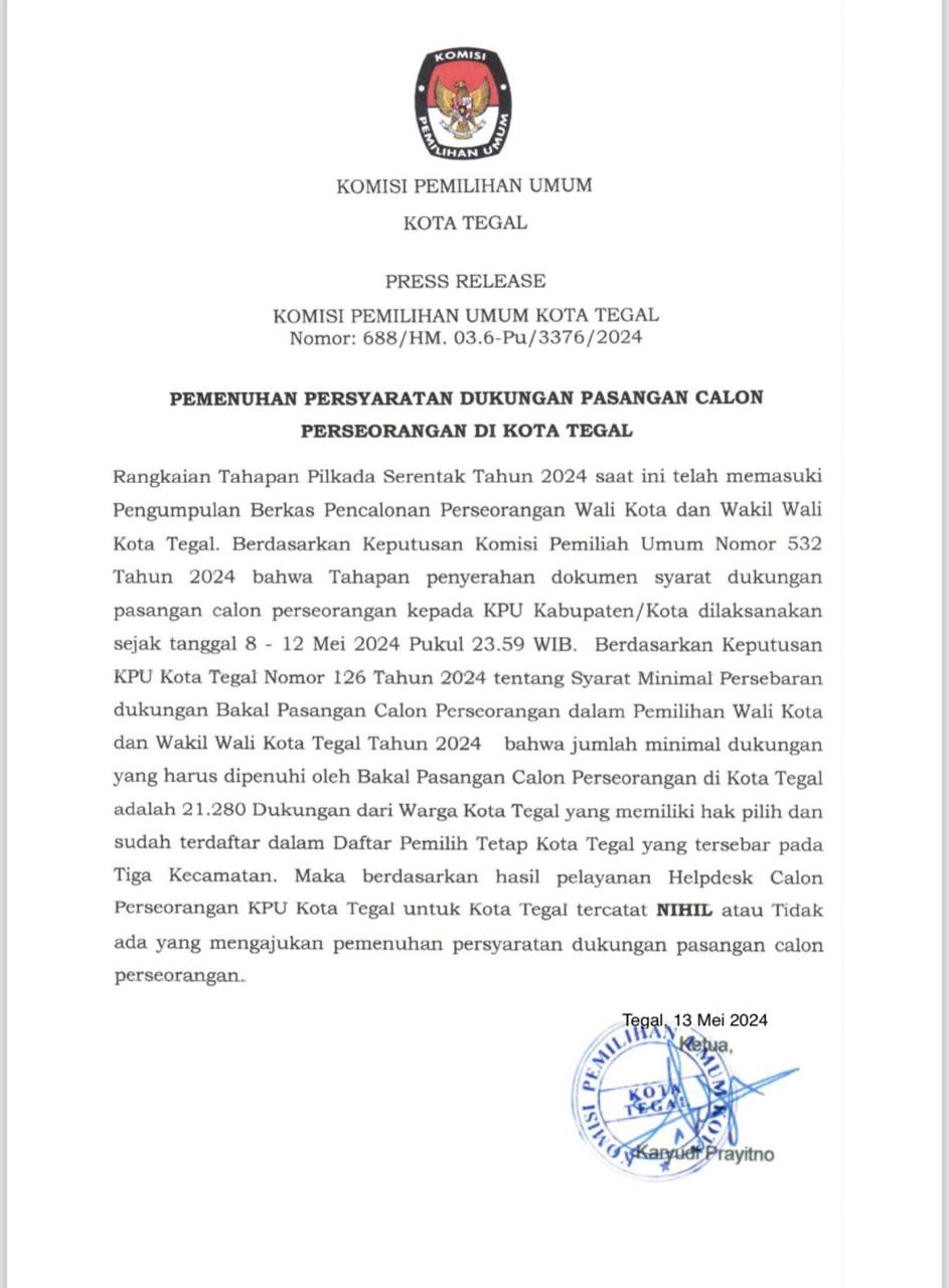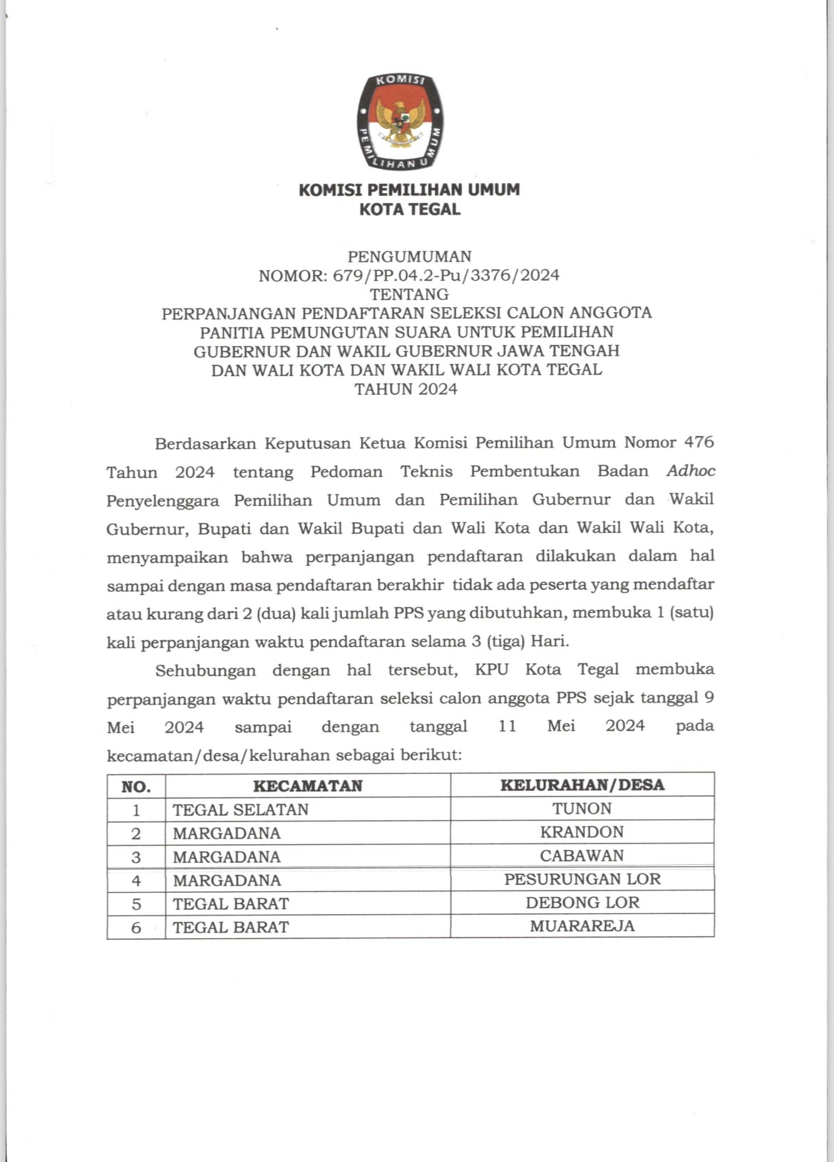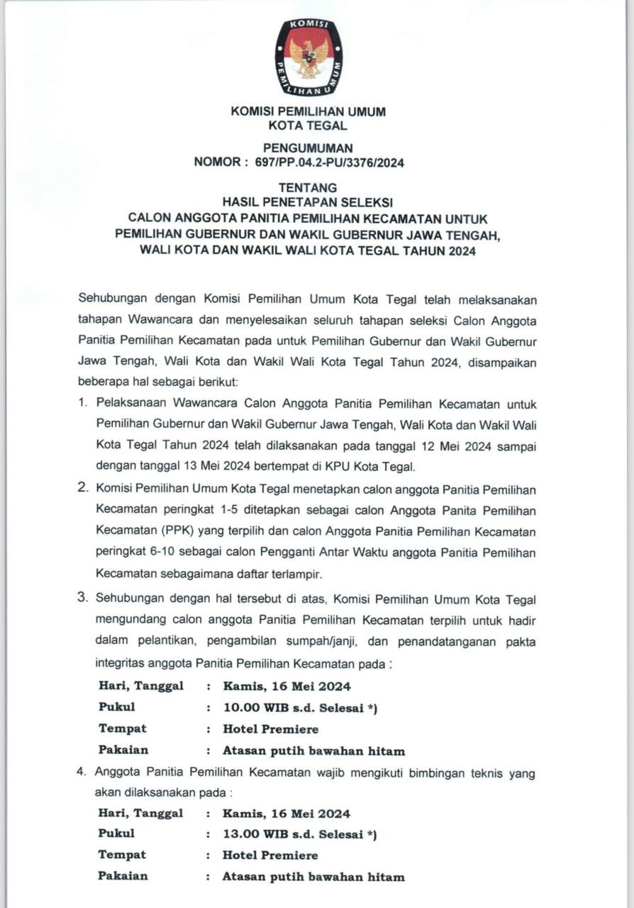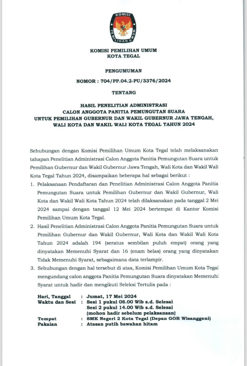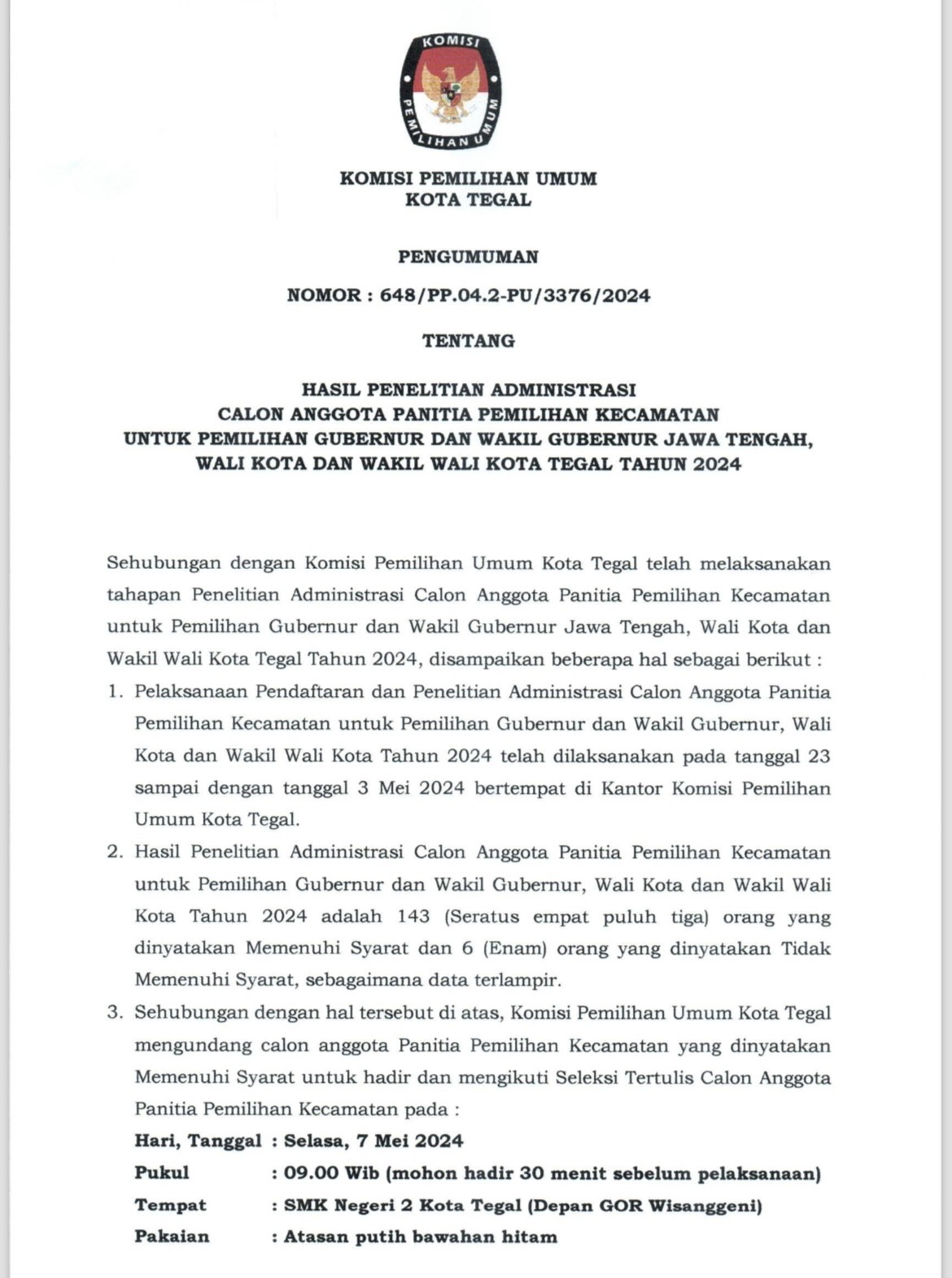 Pengumuman Nomor: 648/PP.04.2-PU 3376/2024 Tentang Hasil Penelitian Administrasi Calon Anggota Panitia Pemilihan Kecamatan Untuk Pemilihan Gubernur dan Wakil Gubernur Jawa Tengah, Wali Kota dan Wakil Wali Kota Tegal Tahu 2024.
