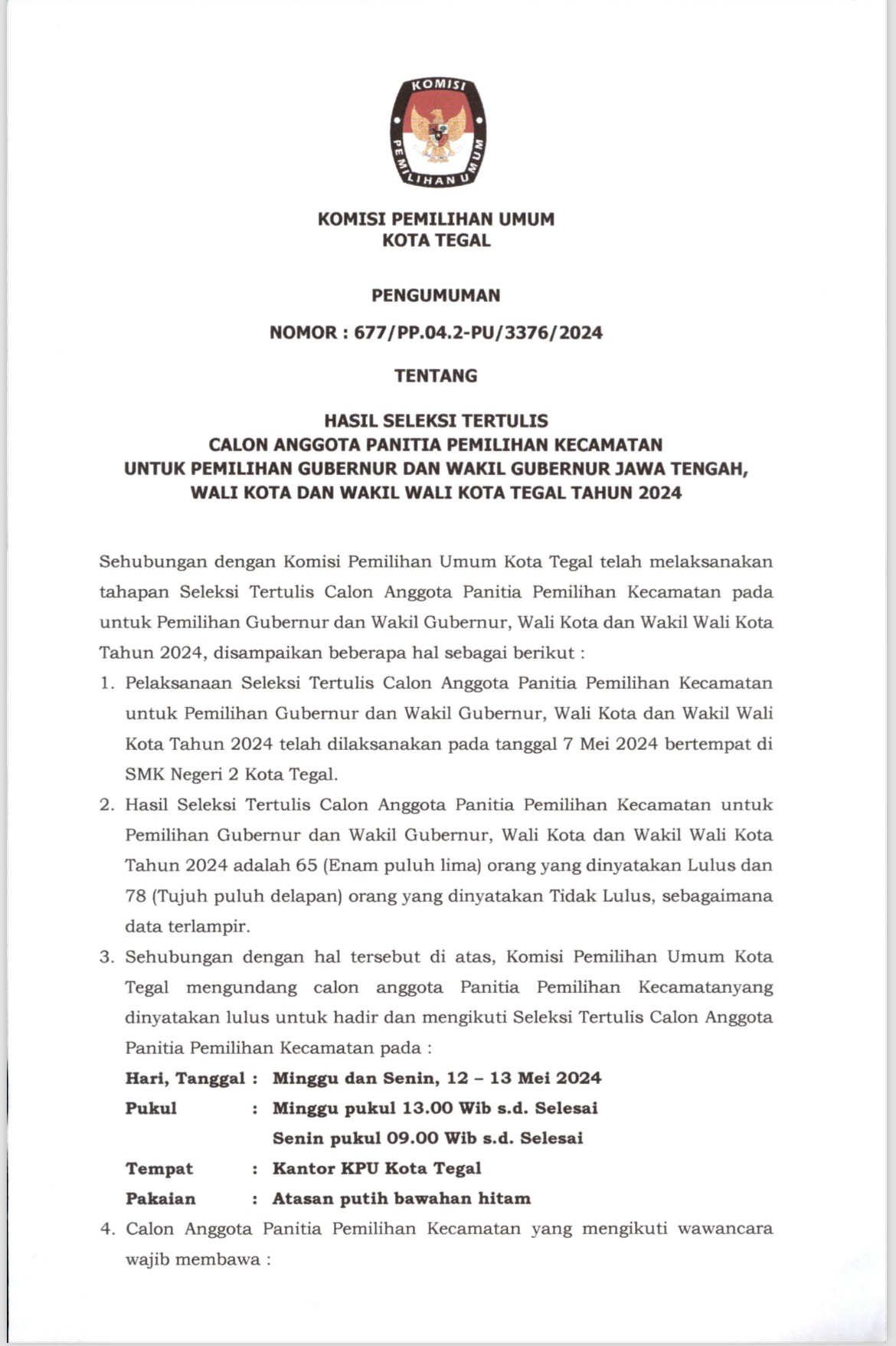 Pengumuman Nomor : 677/PP.04.2-PU 3376/2024 tentang Hasil Seleksi Tertulis Calon Anggota Panitia Pemilihan Kecamatan untuk Pemilihan Gubernur Dan Wakil Gubernur Jawa Tengah Wali Kota dan Wakil Wali Kota Tegal Tahun 2024 dapat di unduh disini