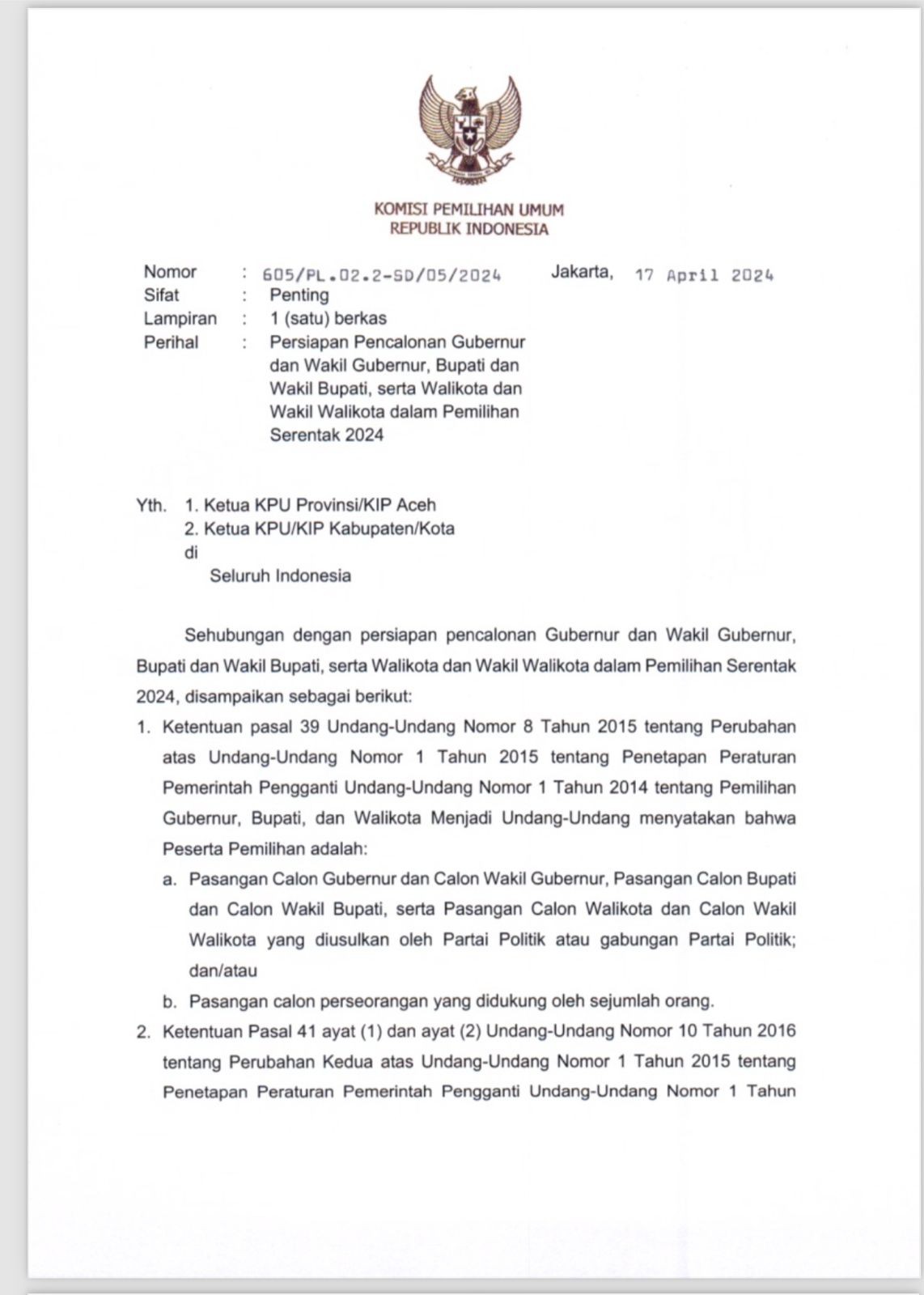 Surat Dinas No 605/PL.02.2-SD/05/2024 tentang Persiapan Pencalonan Gubernur dan Wakil Gubernur, Bupati dan Wakil Bupati, serta Wali Kota dan Wakil Wali Kota dalam Pemilihan Umum Serentak selengkapnya dapat di klik disini