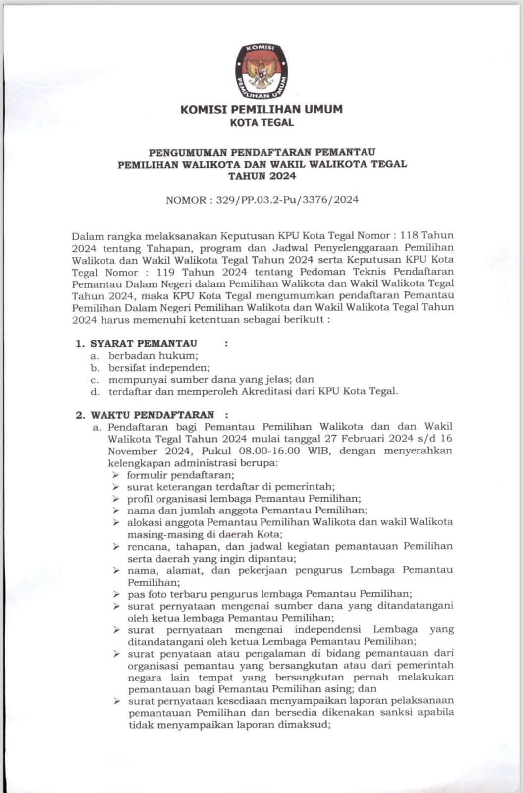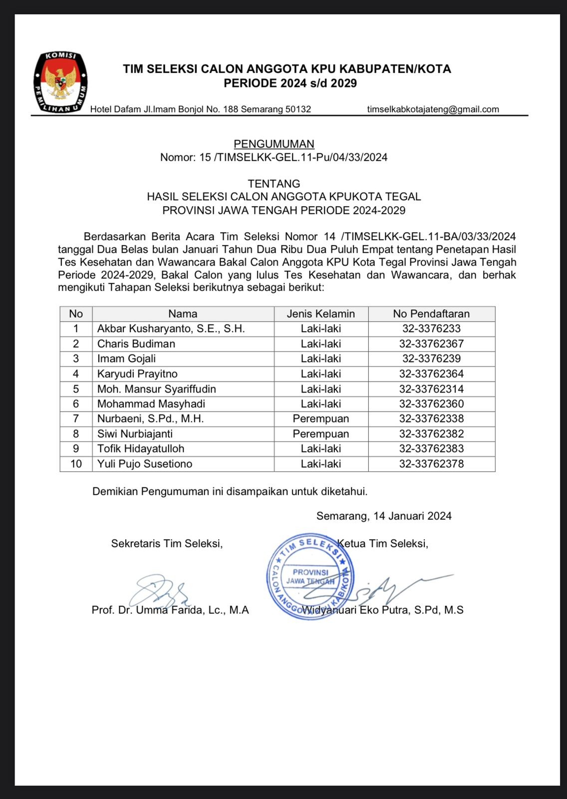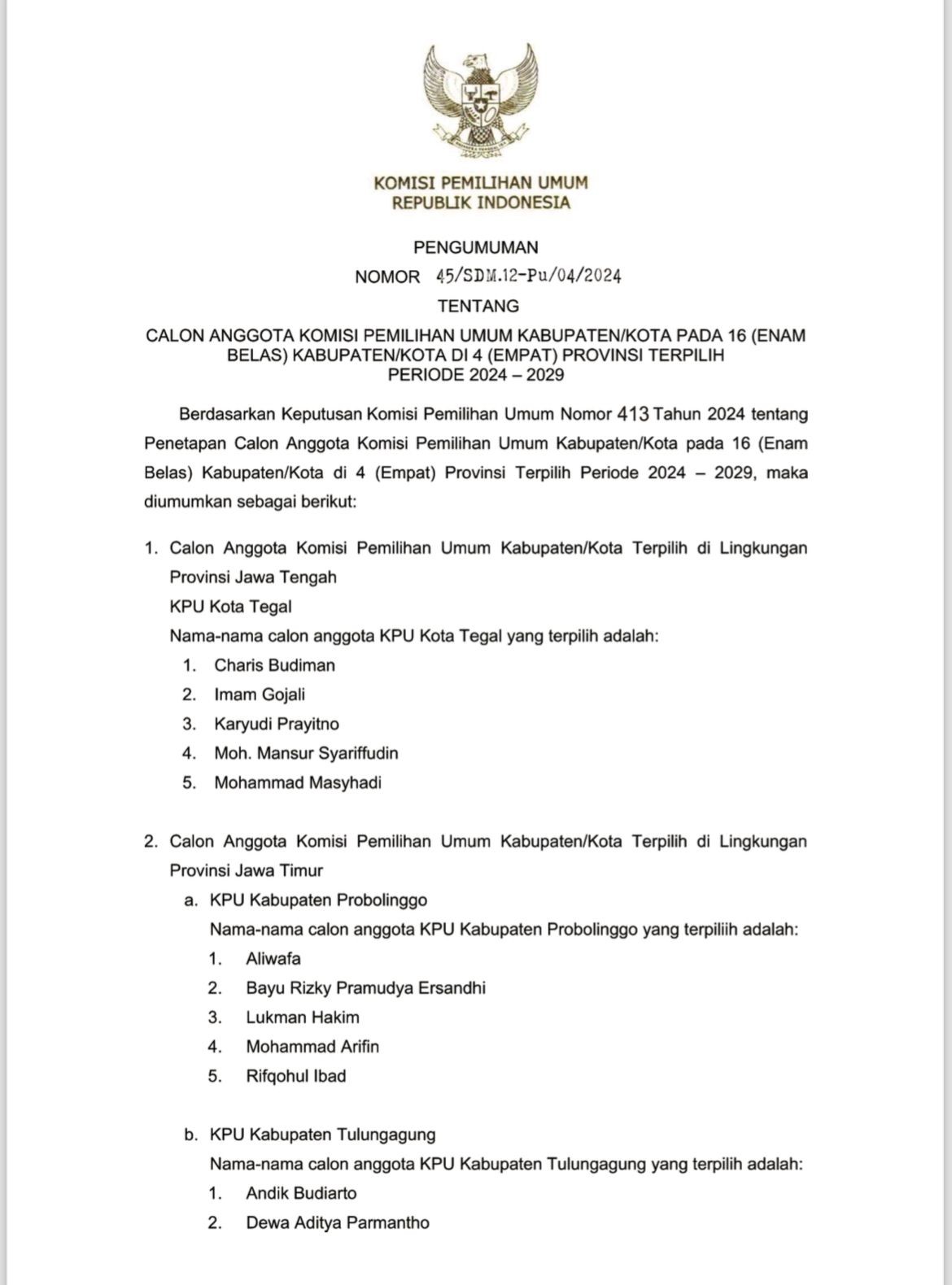 Selengkapnya Pengumuman No 45/SDM.12-Pu/04/2024 tentang Calon Anggota Komisi Pemilihan Umum Kabupaten/ Kota pada 16 (Enam Belas) Kabupaten/ Kota di 4 (Empat) Provinsi Terpilih Periode 2024-2029 klik disini
