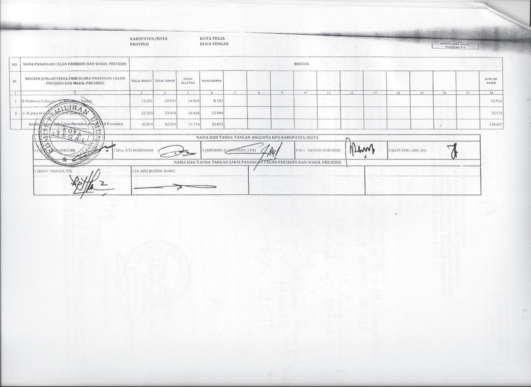 Pemilu adalah sarana kedaulatan rakyat untuk memilih anggota Dewan Perwakilan Rakyat, anggota Dewan Perwakilan Daerah, Presiden dan Wakil Presiden, dan untuk memilih anggota Dewan Perwakilan Rakyat Daerah, yang dilaksanakan secara langsung, umum, bebas, rahasia, jujur, dan adil dalam Negara Kesatuan Republik Indonesia berdasarkan Pancasila dan Undang-Undang Dasar Negara Republik Indonesia Tahun 1945. Hal ini sebagaimana dijelaskan dalam Undang-Undang Nomor 7 Tahun 2017 tentang Pemilihan Umum. Berikut Data Perolehan Suara Pemilu Presiden & Wakil Presiden dan Legislatif di Kota Tegal Tahun 2014: