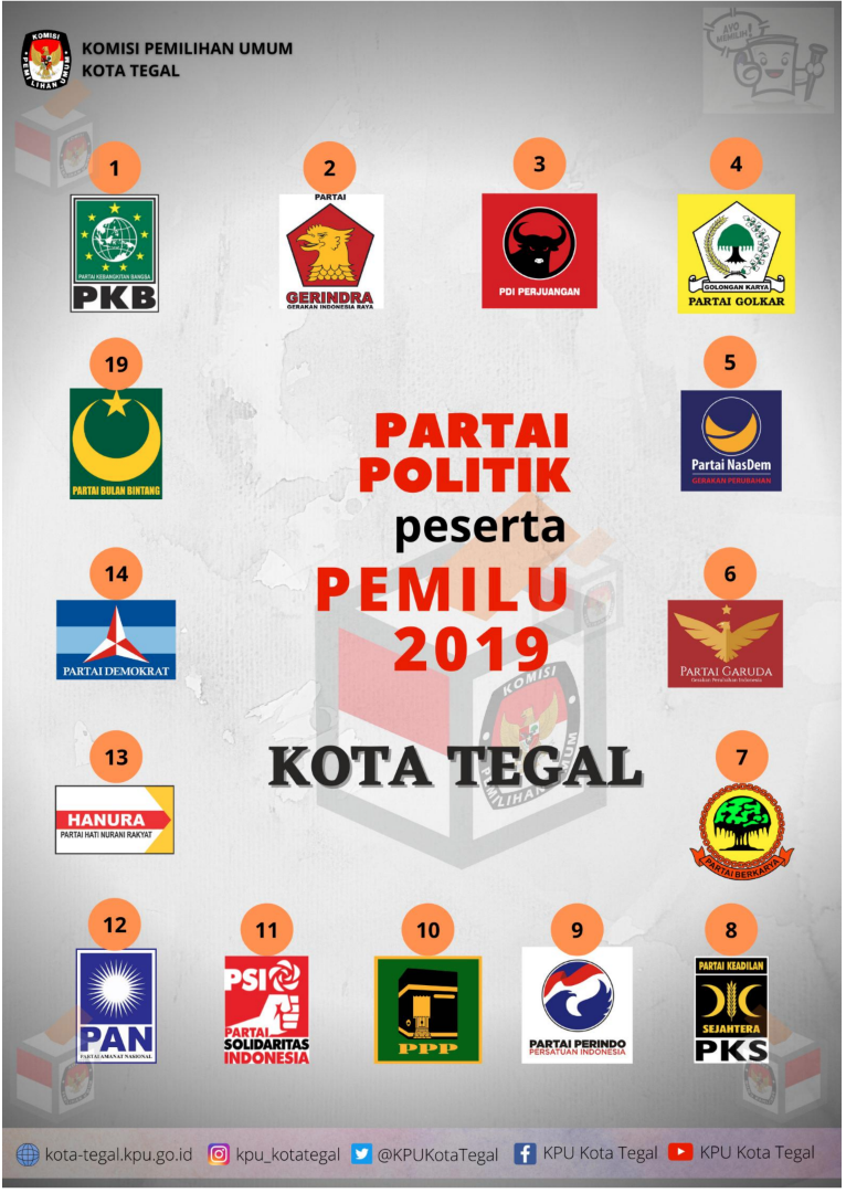 Pemilu adalah sarana kedaulatan rakyat untuk memilih anggota Dewan Perwakilan Rakyat, anggota Dewan Perwakilan Daerah, Presiden dan Wakil Presiden, dan untuk memilih anggota Dewan Perwakilan Rakyat Daerah, yang dilaksanakan secara langsung, umum, bebas, rahasia, jujur, dan adil dalam Negara Kesatuan Republik Indonesia berdasarkan Pancasila dan Undang-Undang Dasar Negara Republik Indonesia Tahun 1945. Hal ini sebagaimana dijelaskan dalam Undang-Undang Nomor 7 Tahun 2017 tentang Pemilihan Umum. Berikut Data Perolehan Suara Pemilu Presiden & Wakil Presiden dan Legislatif di Kota Tegal Tahun 2019: